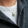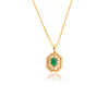 Een klassieker met karakter. Deze verfijnde hanger in geelgoud combineert een levendige smaragd met een dubbele omlijsting van schitterende briljanten.
